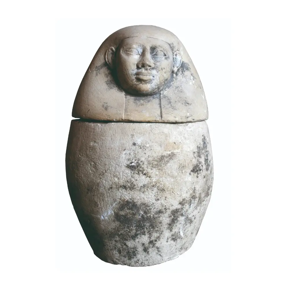 Painted limestone canopic jar with a lid in the shape of a human head, probably dating to the New Kingdom.
