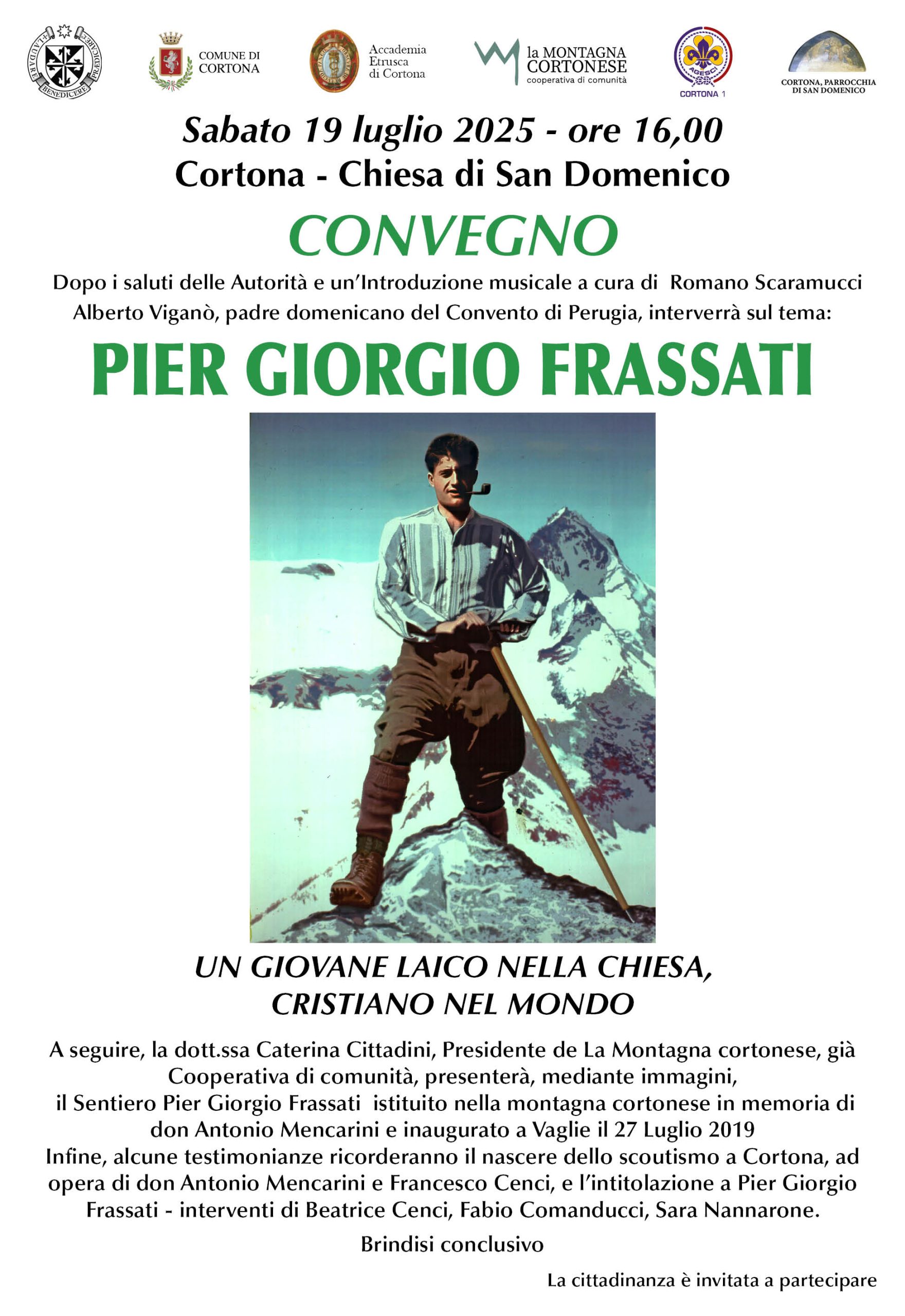 Infine, alcune testimonianze ricorderanno il nascere dello scoutismo a Cortona, ad opera di don Antonio Mencarini e Francesco Cenci, e l’intitolazione a Pier Giorgio Frassati – interventi di Beatrice Cenci, Fabio Comanducci, Sara Nannarone.