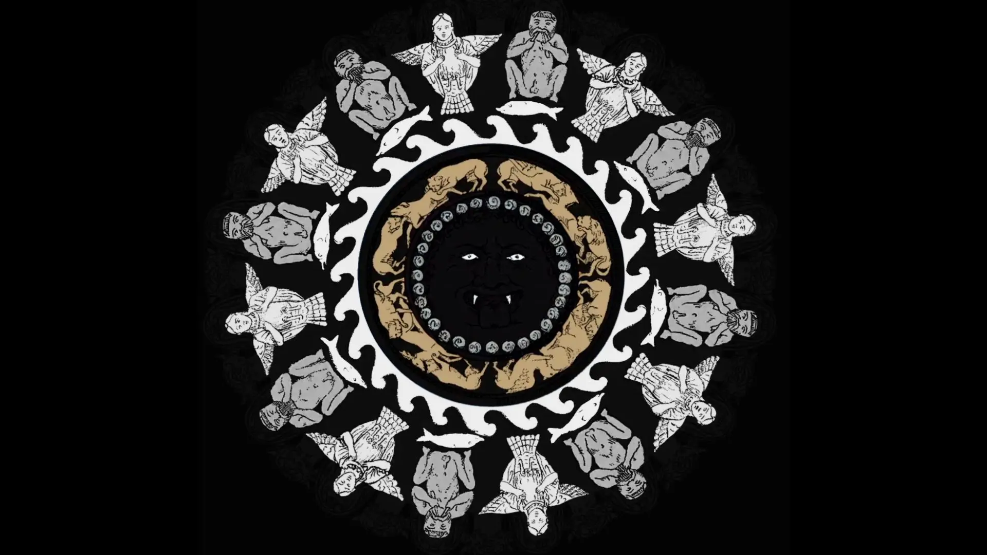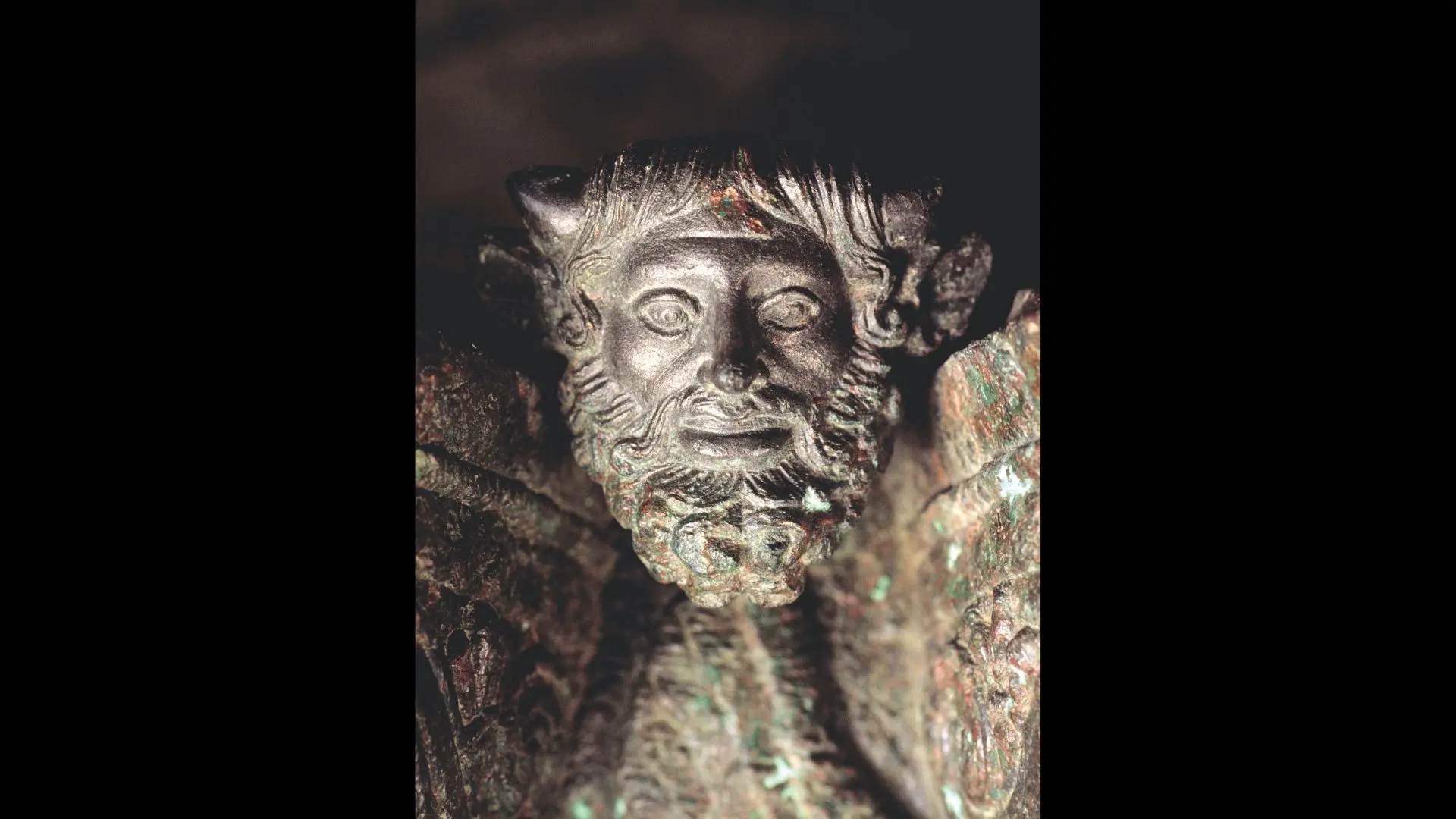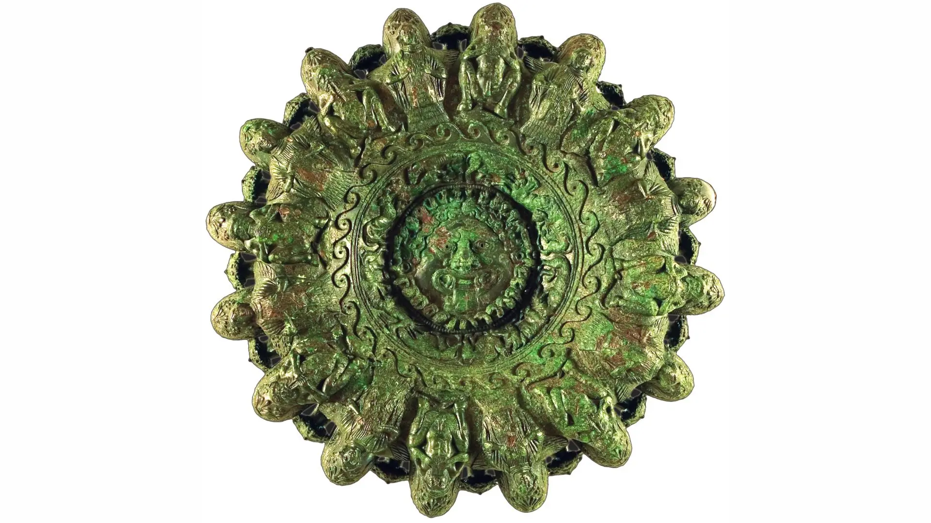 Nella decorazione è presente un’iconografia molto complessa: la fascia esterna corrispondente al lato inferiore dei beccucci è ornata con figure alternate di sileni e di arpie o sirene; i primi suonano la siringa o il doppio flauto, mentre le seconde hanno le braccia piegate sul petto; vi è quindi una fascia con onde stilizzate, sulle quali guizzano delfini, posti regolarmente sotto i piedi dei sileni; nella fascia più interna vi è una serie di cacce di animali, con quattro gruppi di due fiere che assaltano un animale più debole; al centro infine, circondato da una corona di serpentelli, è il gorgoneion con la bocca spalancata e la lingua pendente. Alternate ai beccucci, in cui ardeva la fiamma, sono sedici protomi di Acheloo.