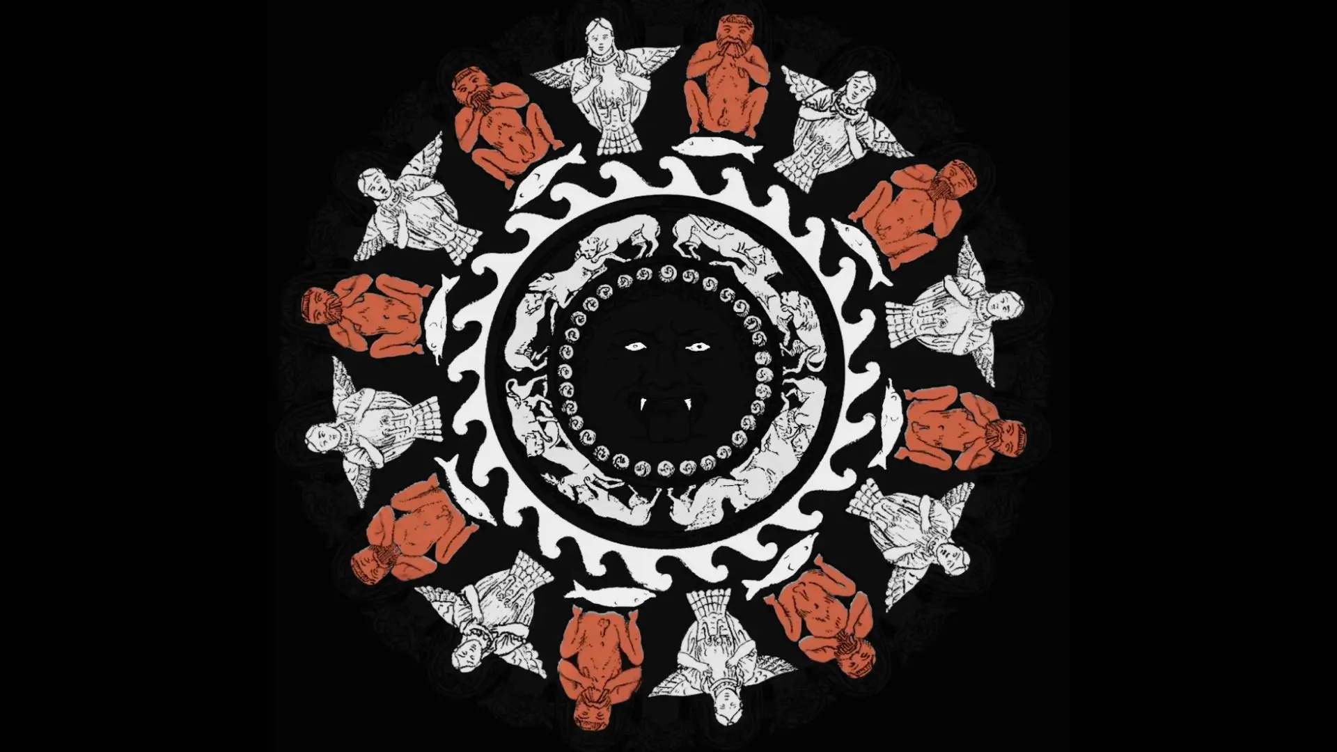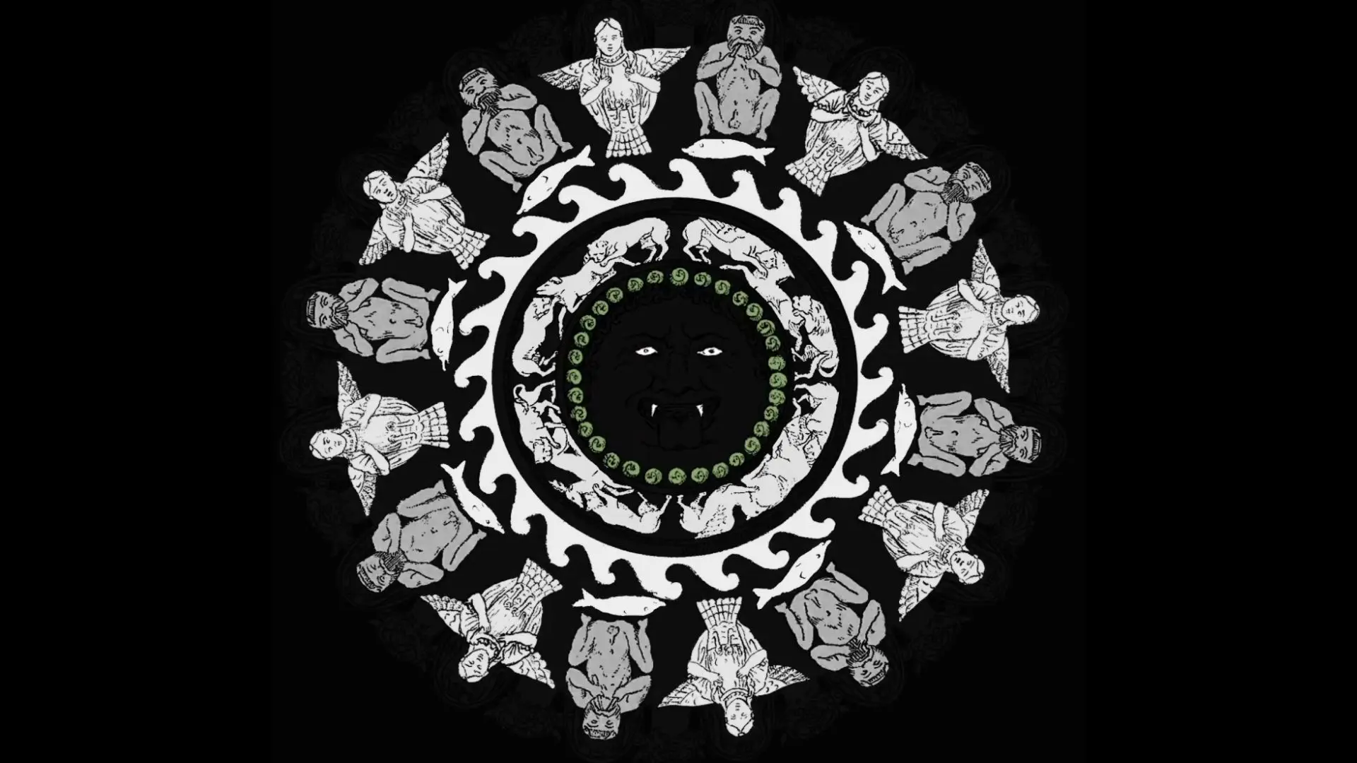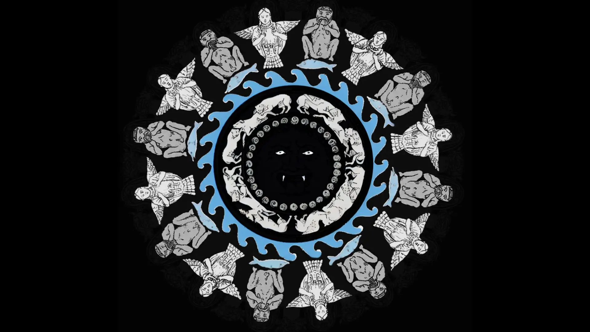 Nella decorazione è presente un’iconografia molto complessa: la fascia esterna corrispondente al lato inferiore dei beccucci è ornata con figure alternate di sileni e di arpie o sirene; i primi suonano la siringa o il doppio flauto, mentre le seconde hanno le braccia piegate sul petto; vi è quindi una fascia con onde stilizzate, sulle quali guizzano delfini, posti regolarmente sotto i piedi dei sileni; nella fascia più interna vi è una serie di cacce di animali, con quattro gruppi di due fiere che assaltano un animale più debole; al centro infine, circondato da una corona di serpentelli, è il gorgoneion con la bocca spalancata e la lingua pendente. Alternate ai beccucci, in cui ardeva la fiamma, sono sedici protomi di Acheloo.
