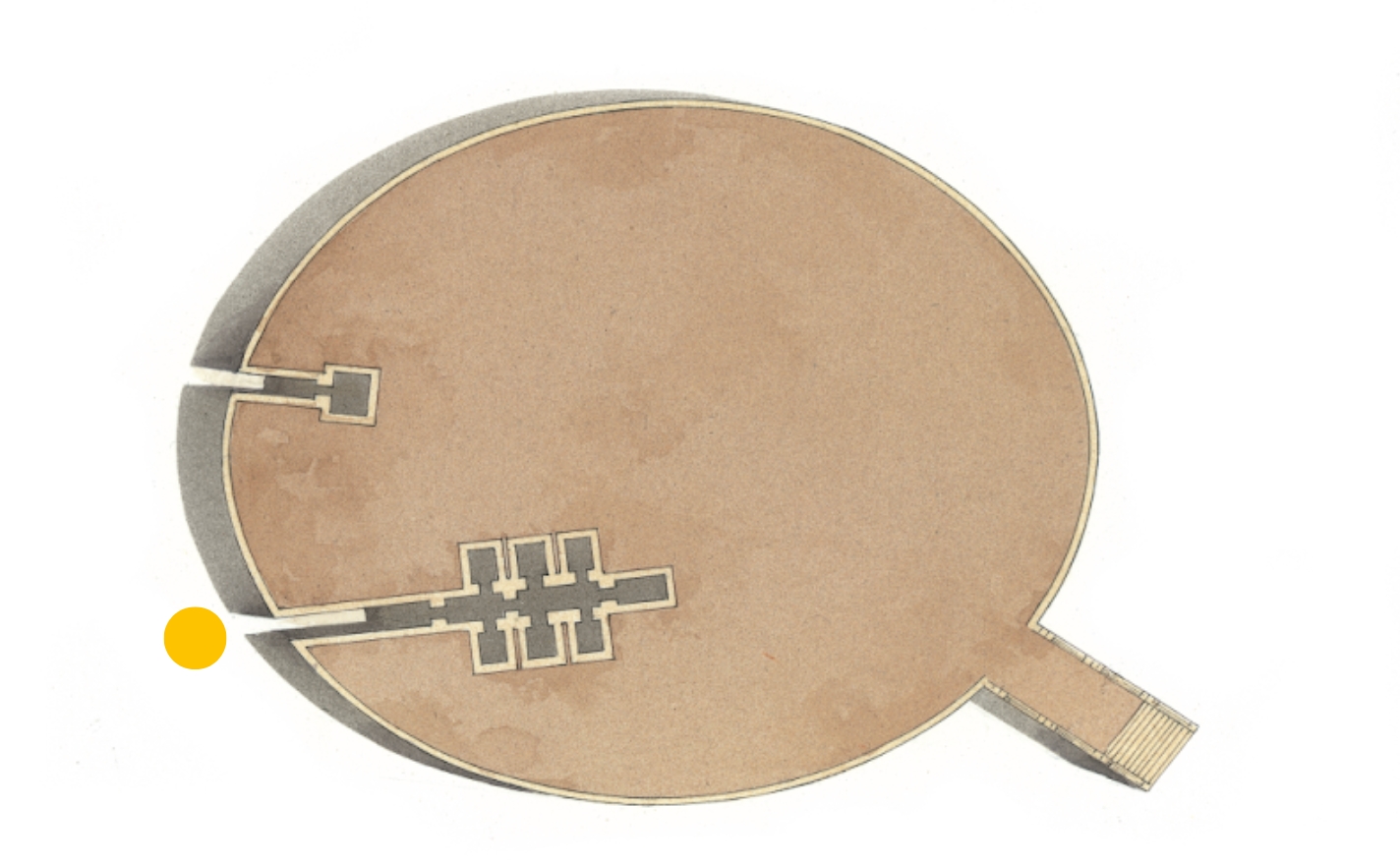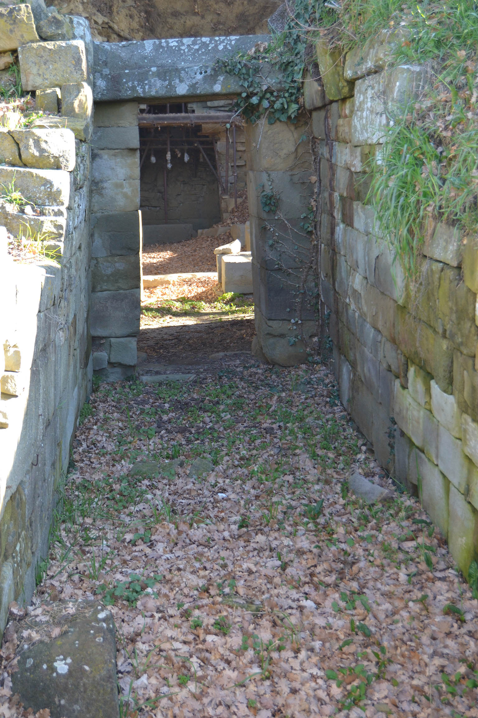 In questo contesto si inserisce la Tomba 1 del Tumulo II del Sodo (580 a.C.), un progetto monumentale articolato in sette camere con coperture a pseudo-volta, oggi in parte crollate. Si accedeva da un corridoio d’ingresso (dromos) e da un portale in pietra serena con pilastri e architrave. Alla base del tumulo correva un tamburo in pietra, elemento sia strutturale che ornamentale.