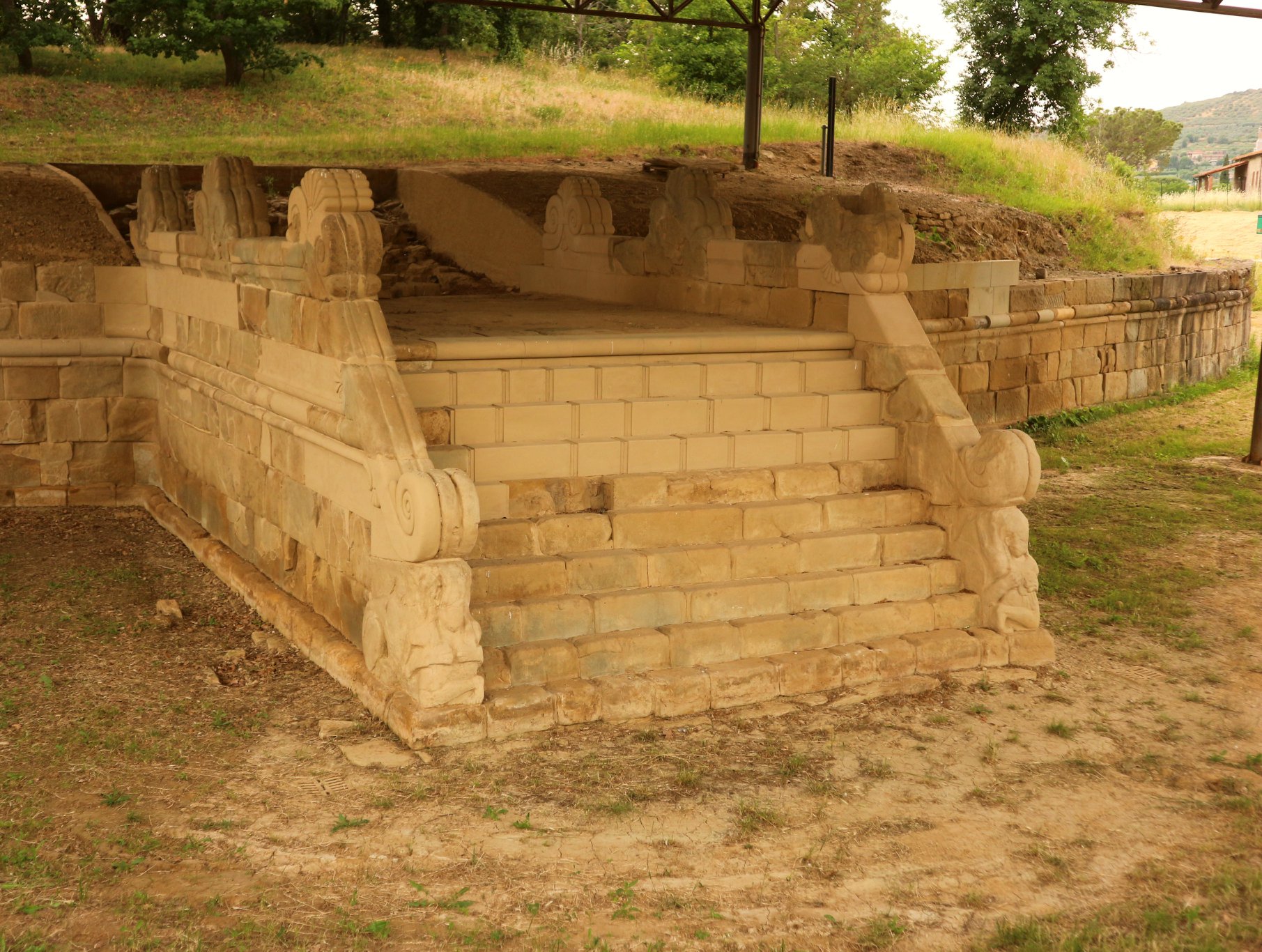 Il monumentale altare etrusco per le celebrazioni funerarie è stato scoperto nel 1990 dalla Soprintendenza Archeologica della Toscana. Si tratta dell’unica tomba etrusca a conservare tuttora in situ un altare con elementi scultorei decorati, databili agli inizi del VI secolo a.C. Lo straordinario Tumulo (o Melone) II del Sodo e una delle due tombe che lo compongono (la tomba 1) erano già note fin dal 1929 ma gli scavi, eseguiti a partire dal 1990, hanno portato alla luce il grande avancorpo monumentale interpretabile come una scalinata-altare costituita da una scalinata di dieci gradini, ornata da una balaustra laterale scolpita, e da un’ampia piattaforma soprastante, forse sede dell’altare ligneo.