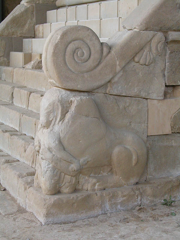 La balaustra presenta una ricca e raffinata decorazione a palmette monumentali, con le ante laterali della gradinata che terminano in due imponenti gruppi scultorei raffiguranti una lotta tra una leonessa e un guerriero, a simboleggiare forse la lotta e la contrapposizione tra la vita e la morte. L’intera struttura, funzionale a cerimonie religiose e pratiche cultuali, doveva essere utilizzata specialmente in occasione delle cerimonie funebri per l’esposizione del cadavere e per tutti i rituali connessi con il funerale.