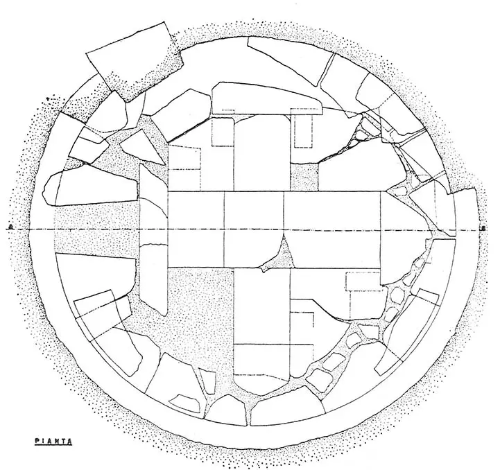 L’interno, a croce greca, presenta ancora un pavimento lastricato in pietra. La porta della stanza si trova nella parte interna del vestibolo e dovevano essere sicuramente presenti dei loculi per la deposizione. Probabilmente vi era una copertura di terra che richiamava la forma dei tumuli arcaici del Sodo, cui la tomba si ispira, sia dal punto di vista architettonico che ideologico. All’esterno è conservata la parte inferiore del basamento circolare di diametro m 10,35 ed era costituita da blocchi di macigno e qualche blocco del coronamento.
