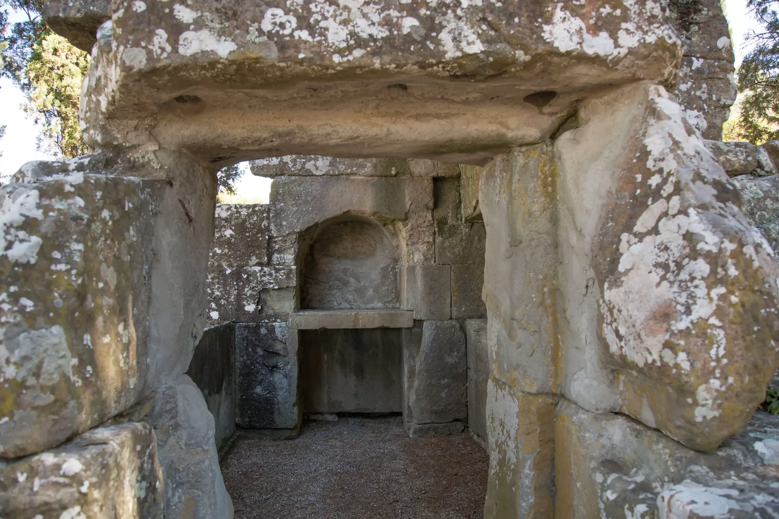 La struttura è impostata su un basamento circolare formato da lastre di pietra arenaria poggiate sul terreno roccioso; la fascia esterna è composta da otto blocchi di pietra di dimensioni diverse, giustapposti senza impiego di malta. L’ingresso è costruito da un breve dromos a pianta trapezoidale, delimitato sui lati dai blocchi del basamento e in alto dall’architrave sul quale era incardinata la porta in pietra a doppio battente. Il piccolo ambiente interno, a pianta rettangolare, lungo m 2,60 e largo m 2,05, ha sulle pareti laterali e sul fondo una serie di nicchie per la deposizione delle urne o delle olle cinerarie, e, forse, dei rispettivi corredi. Il sistema di copertura prevede una volta a botte formata da cinque monoliti accostati con cura gli uni agli altri; probabilmente vi era una copertura di terra che richiamava la forma dei tumuli arcaici del Sodo.